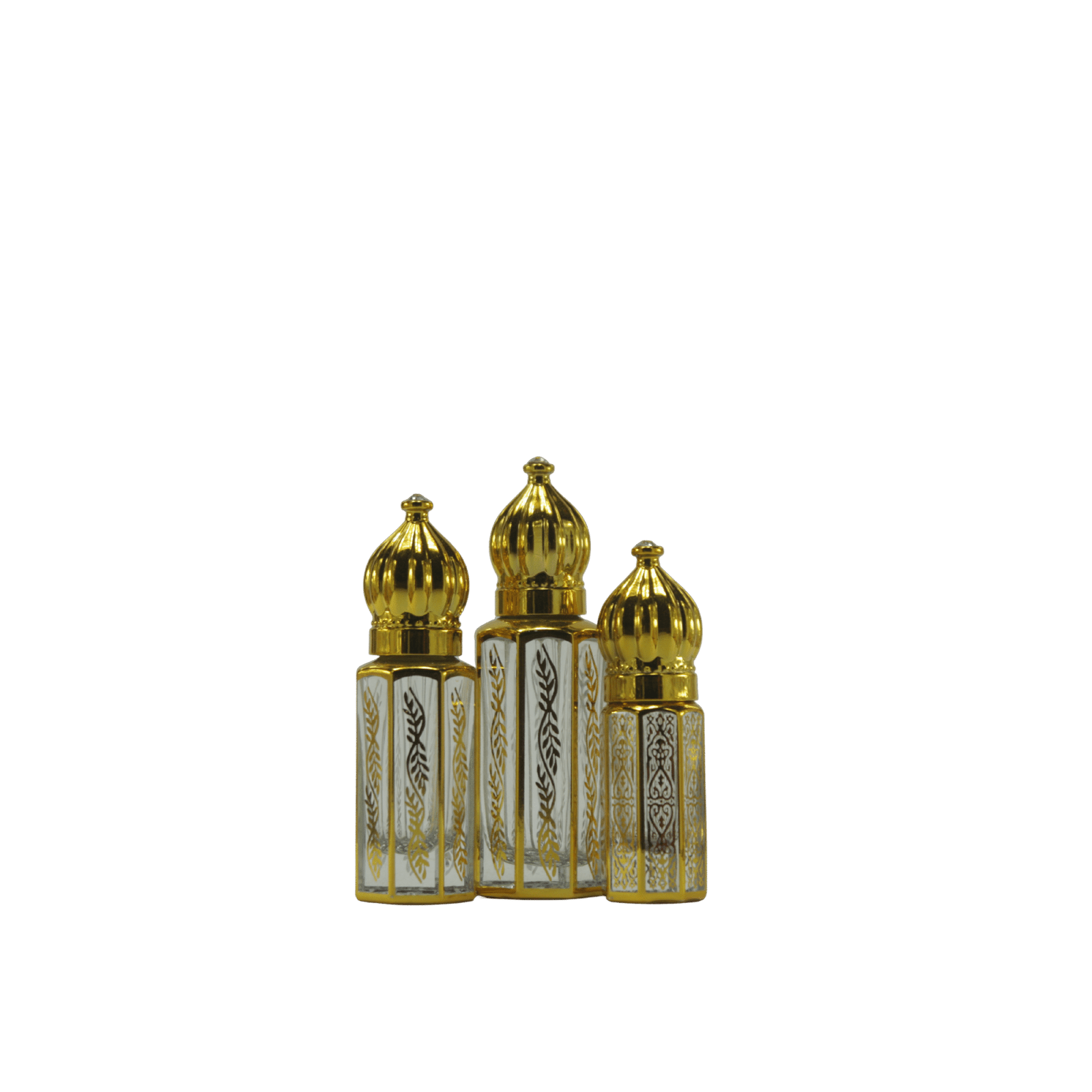 Le Flacon Musc Royal incarne le raffinement oriental. En verre décoré avec un bouchon doré en coupole, il est disponible en 3ml, 6ml et 12ml pour vos muscs et huiles parfumées.