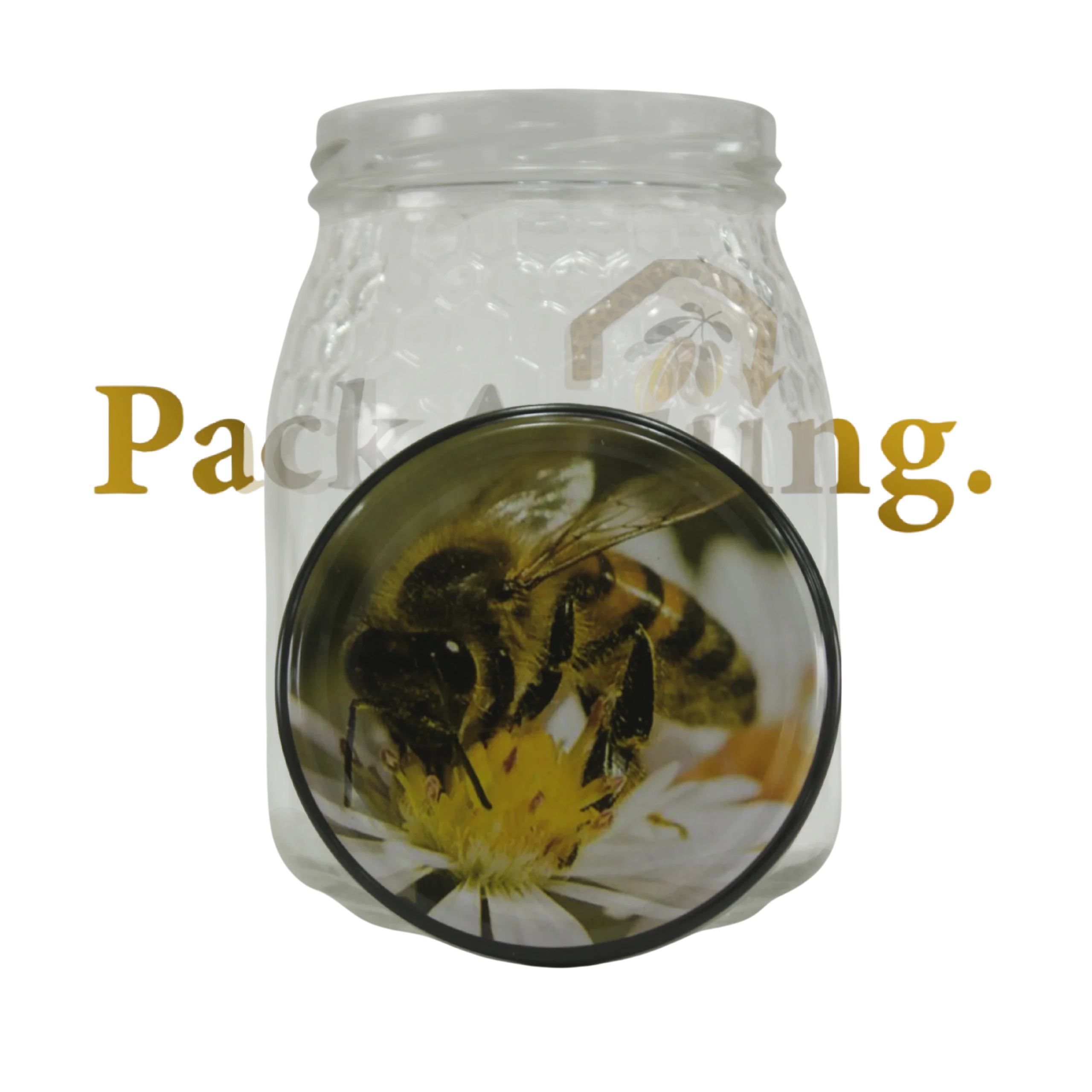 Bocal en verre Nehla avec relief type ruche et couvercle illustré d’une abeille. Idéal pour le conditionnement du miel. Disponible en 500g et 1kg chez Pack’Arijing, votre spécialiste des emballages au Maroc.
